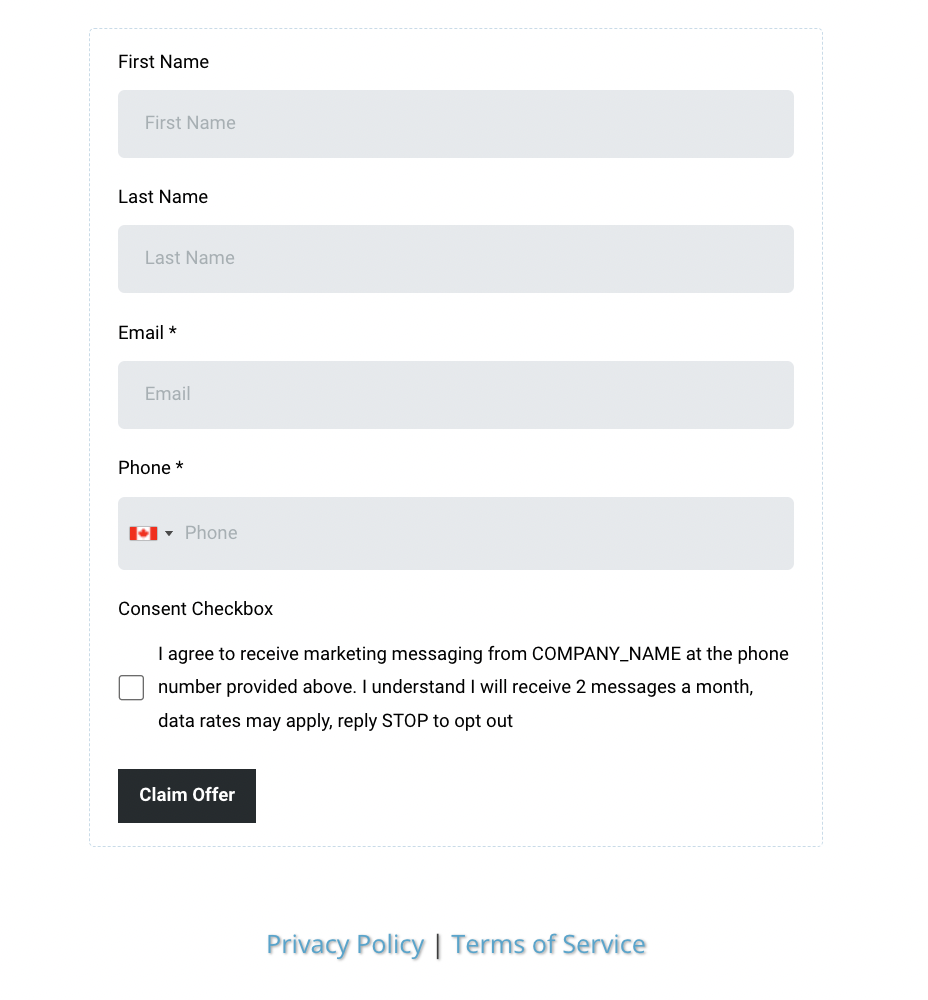 - Opt-in consent message and checkbox must be separated from the Privacy Policy | Terms of Service consent and checkbox.