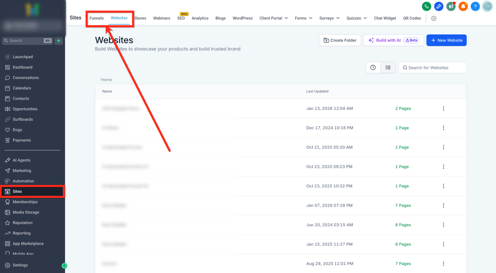 Note: Schema is page-specific and does not carry over to other pages or funnel steps.- Go to Sites.