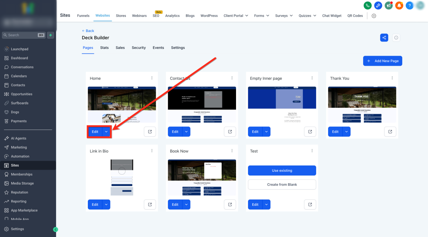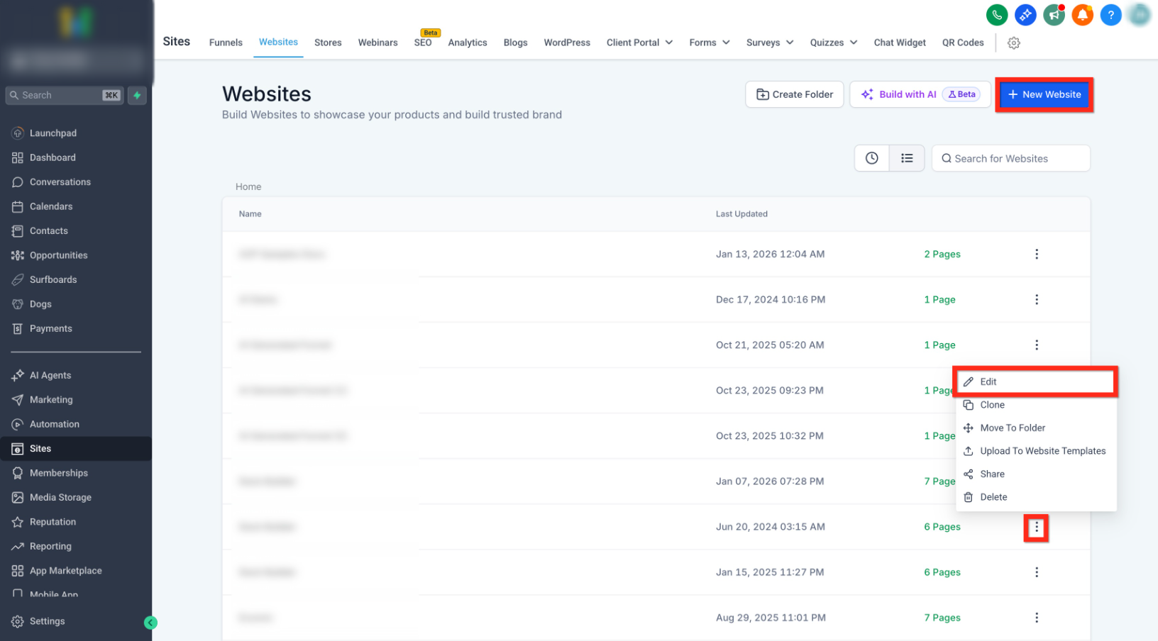 - Click Edit on the specific Website page or Funnel step you want to update.